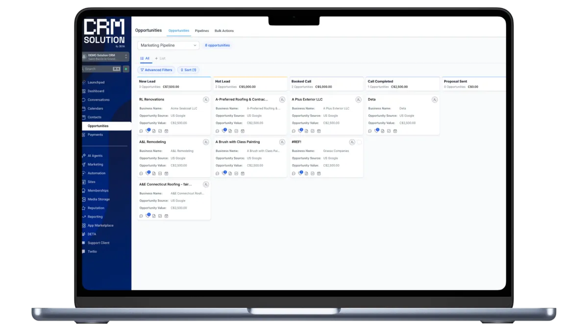 Fini les dizaines d'applications séparées. Avec Solution CRM, gérez vos ventes, votre marketing, vos rendez-vous, votre réputation et vos automatisations depuis une seule plateforme.